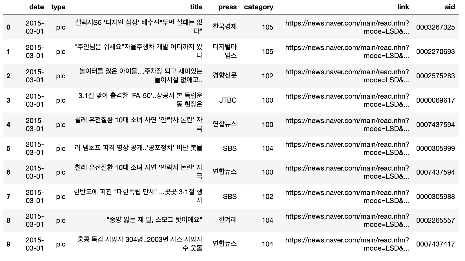 columns = ["date", "type", "title", "press", "category", "link", "aid"])