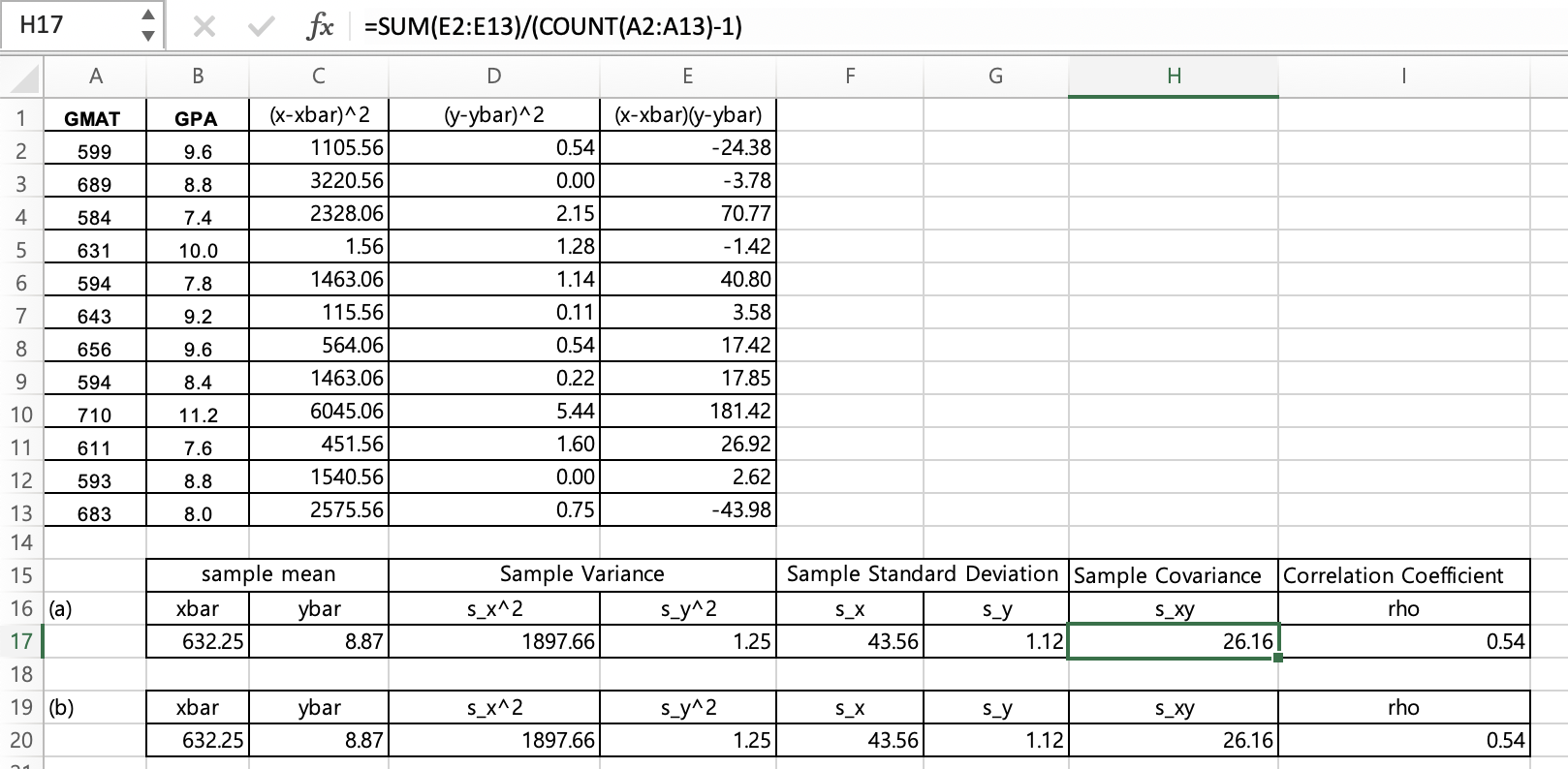 GPA 각각의 표본평균, 표본분산, 표본표준편차 및 GMAT 점수와 GPA 간의 표본공분산, 상관계수를 계산하시오