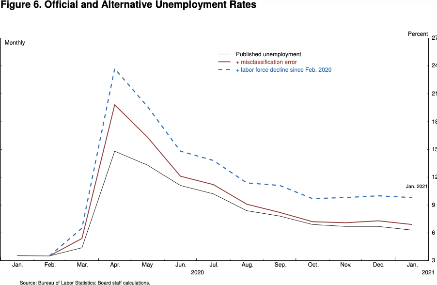 After rising to 14.8 percent in April of last year, the published unemployment rate has fallen relatively swiftly, reaching 6.3 percent in January. But published unemployment rates during COVID have dramatically understated the deterioration in the labor market. Most importantly, the pandemic has led to the largest 12-month decline in labor force participation since at least 1948. (종전 이후와 다를 바 없는 힘든 상황) (Fear of the virus and the disappearance of employment opportunities in the sectors most affected by it, such as restaurants, hotels, and entertainment venues, have led many to withdraw from the workforce. At the same time, virtual schooling has forced many parents to leave the work force to provide all-day care for their children. All told, nearly 5 million people say the pandemic prevented them from looking for work in January. In addition, the Bureau of Labor Statistics reports that many unemployed individuals have been misclassified as employed. Correcting this misclassification and counting those who have left the labor force since last February as unemployed would boost the unemployment rate to close to 10 percent in January.