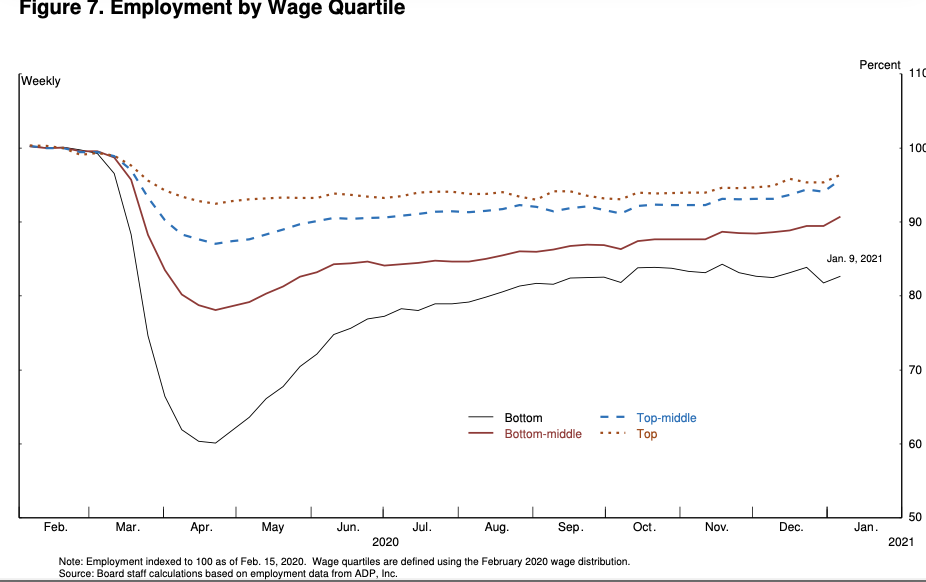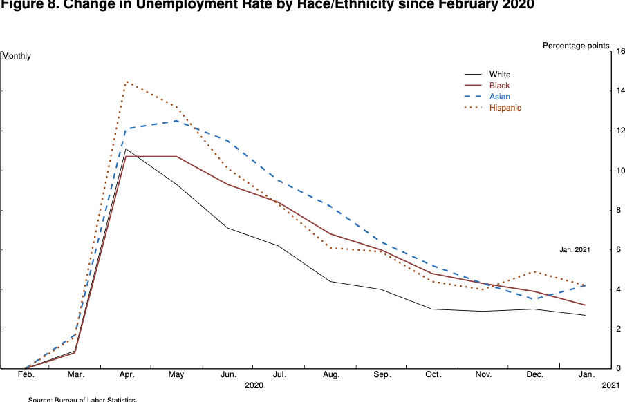 Moreover, employment for these workers has changed little in recent months, while employment for the higher-wage groups has continued to improve. Similarly, the unemployment rates for Blacks and Hispanics have risen significantly more than for whites since February 2020.