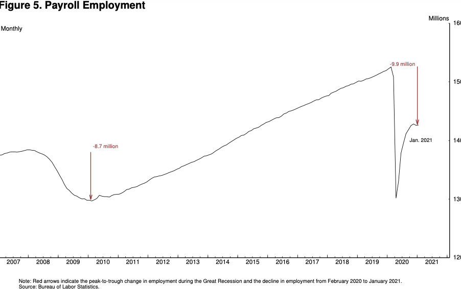 The state of our labor market today could hardly be more different. Despite the surprising speed of recovery early on, we are still very far from a strong labor market whose benefits are broadly shared. Employment in January of this year was nearly 10 million below its February 2020 level, a greater shortfall than the worst of the Great Recession's aftermath.